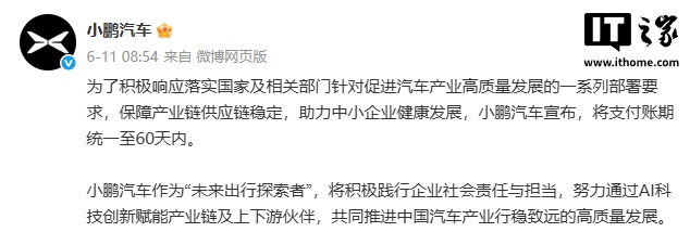 IT之家 7 月 11 日消息,据澎湃新闻报道,工信部开通账期承诺相关窗口两日后,已有车企向供应商发布书面通知。今日,记者从小鹏汽车供应链方面获得了一份来自小鹏汽车的通知邮件。
