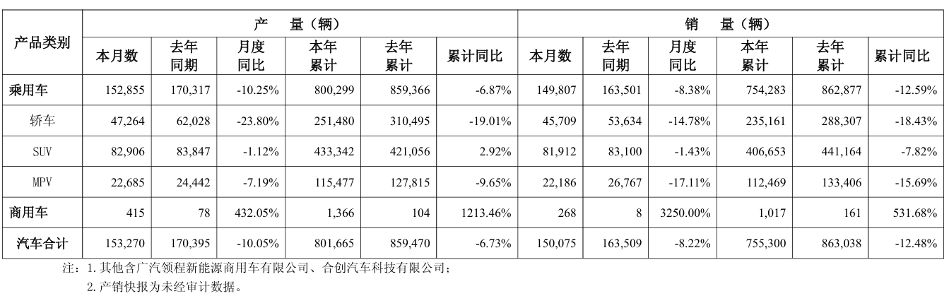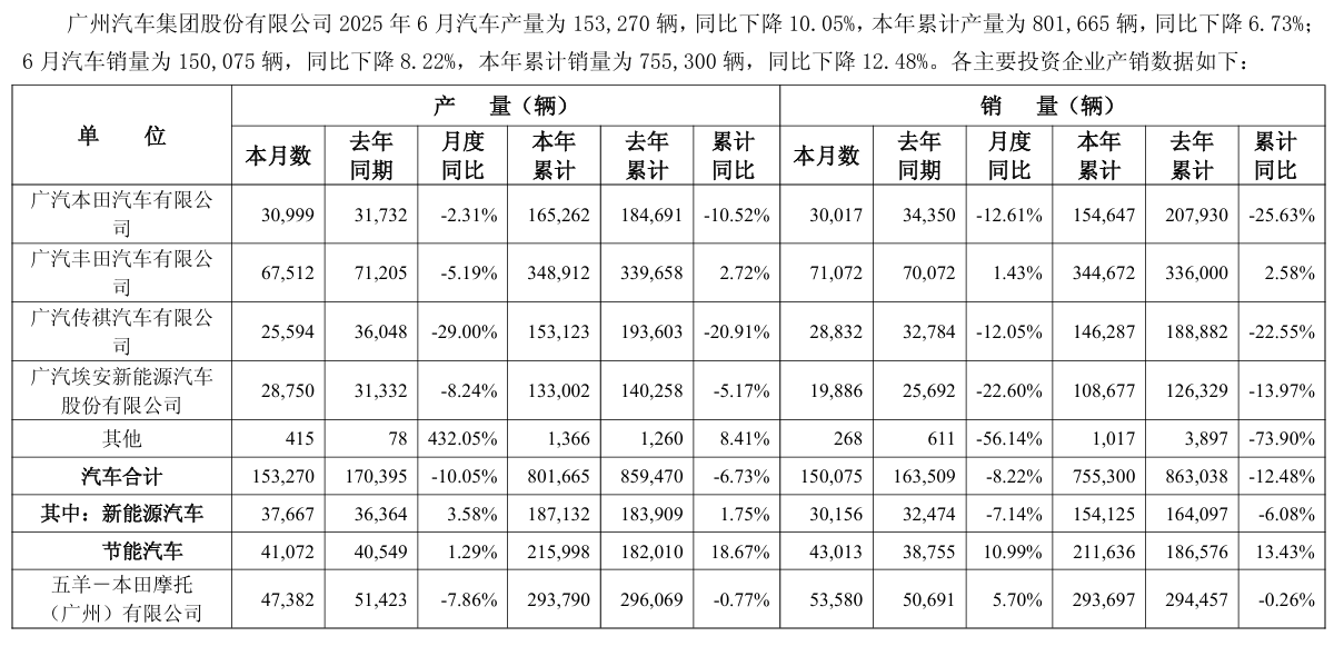 IT之家查询获悉,广汽集团 2025 年 6 月汽车销量为 15.01 万辆,与去年同期比较下降 8.22%,环比上升 27.5%;本年累计销量为 75.53 万辆,与去年同期比较下降 12.48%。