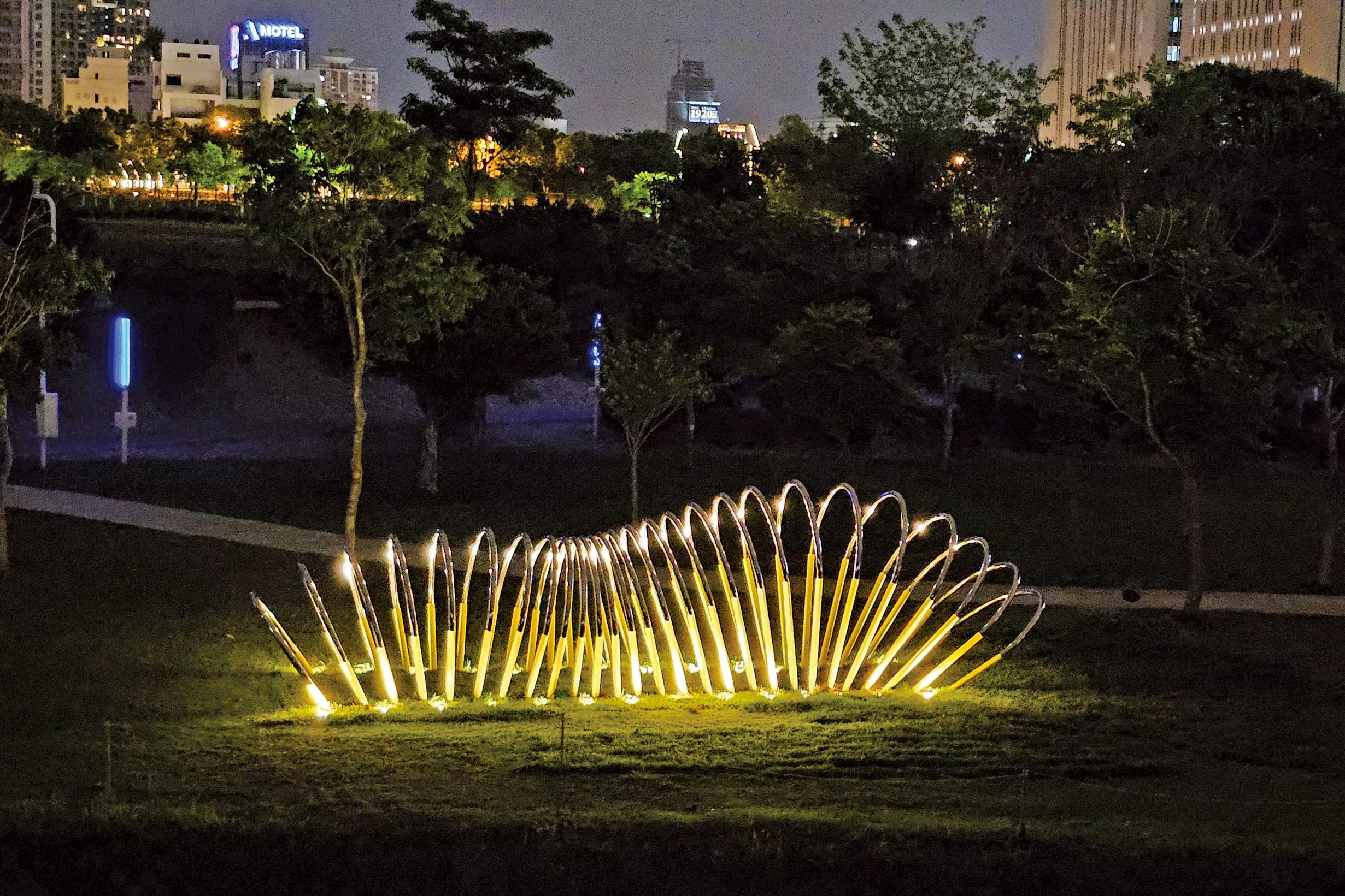 《綠野遊蹤》的魅力,在於其日與夜的截然不同。白晝,陽光穿透弧形骨架,孩子們在其間自由穿梭嬉戲,讓藝術真正走入市民的日常,成為生活的一部分;當夜幕低垂,郭國相為其設計了精密的燈光控制系統,透過漸變的韻律,模擬毛毛蟲的呼吸與蠕動,彷彿在星空下真的活了過來,緩緩前行,引領遊人進入如夢似幻的「奇幻通道」。