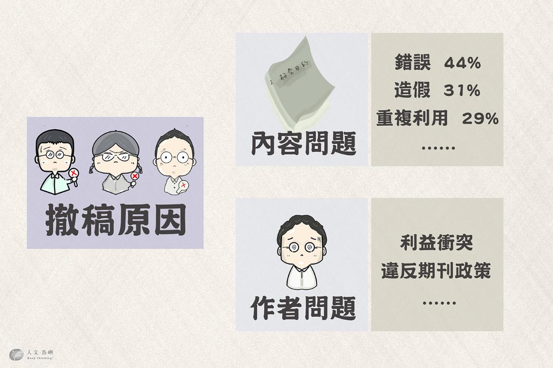 黃慕萱提出的撤稿原因分類架構中,最常見的仍是內容問題,包括內容錯誤、造假以及重複利用,由於一篇論文被撤稿可能同時涉及不只一項原因,三者比例在重複計算下總和大於100%。過去很少有研究對包羅萬象的撤稿原因進行有系統的歸納或分類,所以較難分析不同研究領域的撤稿原因是否存在差異。(企劃腳本/林義宏 ,美術設計/林柏希)