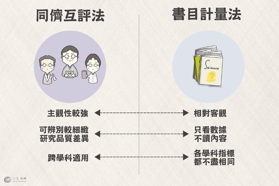 同儕互評注重學術同行的專業判斷,書目計量則以學者產出的論文書目資料為主體,兩者各擅勝場,應為彼此截長補短的互補關係;至於兩者的權重分配,則應視研究領域的特質而定。(企劃腳本/林義宏 ,美術設計/林柏希)