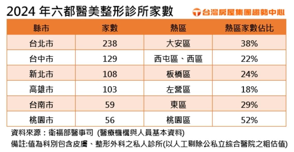 進一步觀察,全台2024年兒科及婦產科醫院含診所家數,相比2020年,分別減少約3%及5%,反觀近年醫美盛行,皮膚科及整形外科醫療院所家數均呈逐年成長,分別增加4%及6%。如剔除大型綜合醫院,粗估六都私人醫美皮膚、整形外科診所,台北市診所家數粗估就逾200間,居六都之冠,其中又以大安區最為密集,家數佔比近4成,尤以忠孝東路四段堪稱醫美一條街,單一路段估計就有約30家醫美整形診所。