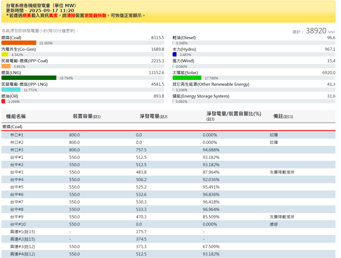 然而,不只林口二號機出事,林口一號機也在今(17)日出現故障,在台電系統各機組發電量網站中,雙雙標記著「故障」2字。