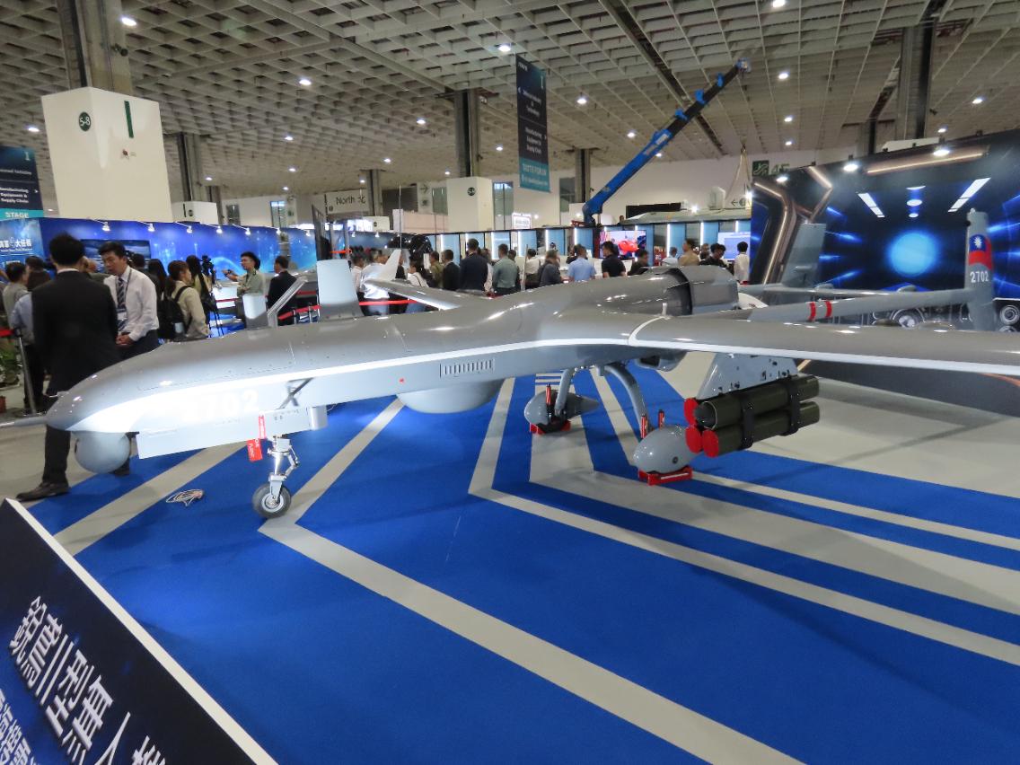 無人載具展區部分,有鑒於俄烏戰爭無人機運用成效,國防部整合無人機產業技術能量,採軍用商規在地化生產,並與國內外軍工產業合作,展出空中、地面及水下,以及勁蜂一到四型無人機家族、「電動無人自駕戰術車」、「小型快速無人艇」、「水下自主無人多功能載具」等19項實體無人載具,以及「彈簧刀300、ALTIUS 600M無人機」模型,持續建構不對稱戰力優勢,帶動無人機產業全面升級。