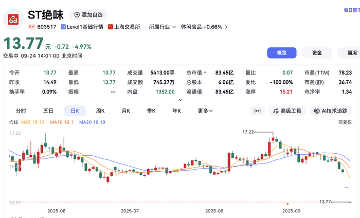 该公司于9月22日停牌,9月23日被实施风险警示,A股简称变更为“ST绝味”。实施风险警示后,该股票将在风险警示板交易,股票价格的日涨跌幅限制为5%。