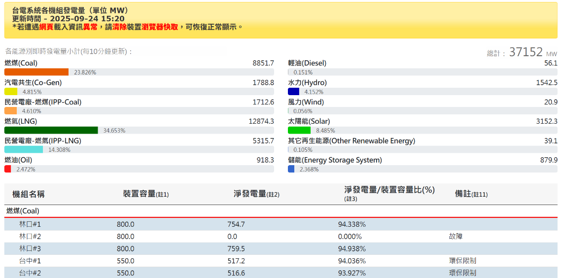 至於林口兩機組雙雙故障,於17日高溫破管的林口一號機,原先台電預估將在22日即可修復完畢,但因破管洩漏位置複雜,拉長施工時間,最後於23日下午併聯發電。根據台電官網顯示,目前發電容量已恢復至往日水準。