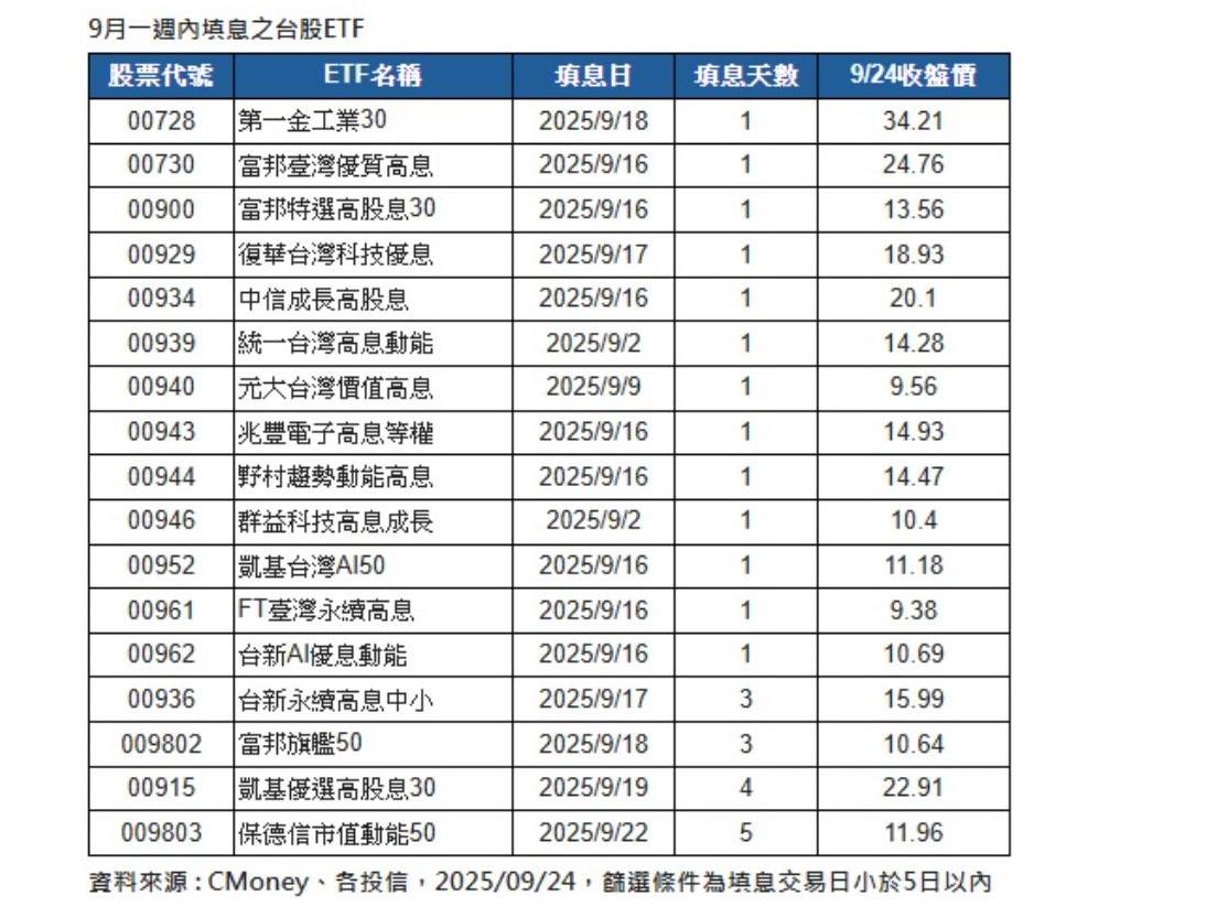 在台股多頭一波波的加持下,帶動9月填息行情大好,保德信指出,統計9月以來除息之台股ETF,共有17檔ETF在除息後一週(5個交易日)內順利填息,包括保德信市值動能50ETF (本基金之配息來源可能為收益平準金)、富邦旗艦50等首次配息的台股ETF新兵,另外,還有13檔ETF在台股創高帶動下,1天內即順利完成填息任務,表現亮眼。