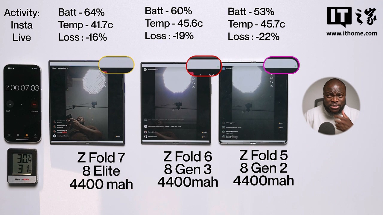 IT之家 7 月 12 日消息,YouTube 频道 Lover of Tech 在最新一期视频中,测试了三星 Galaxy Z Fold7、Galaxy Z Fold6 和 Galaxy Z Fold5 三款折叠手机续航表现。