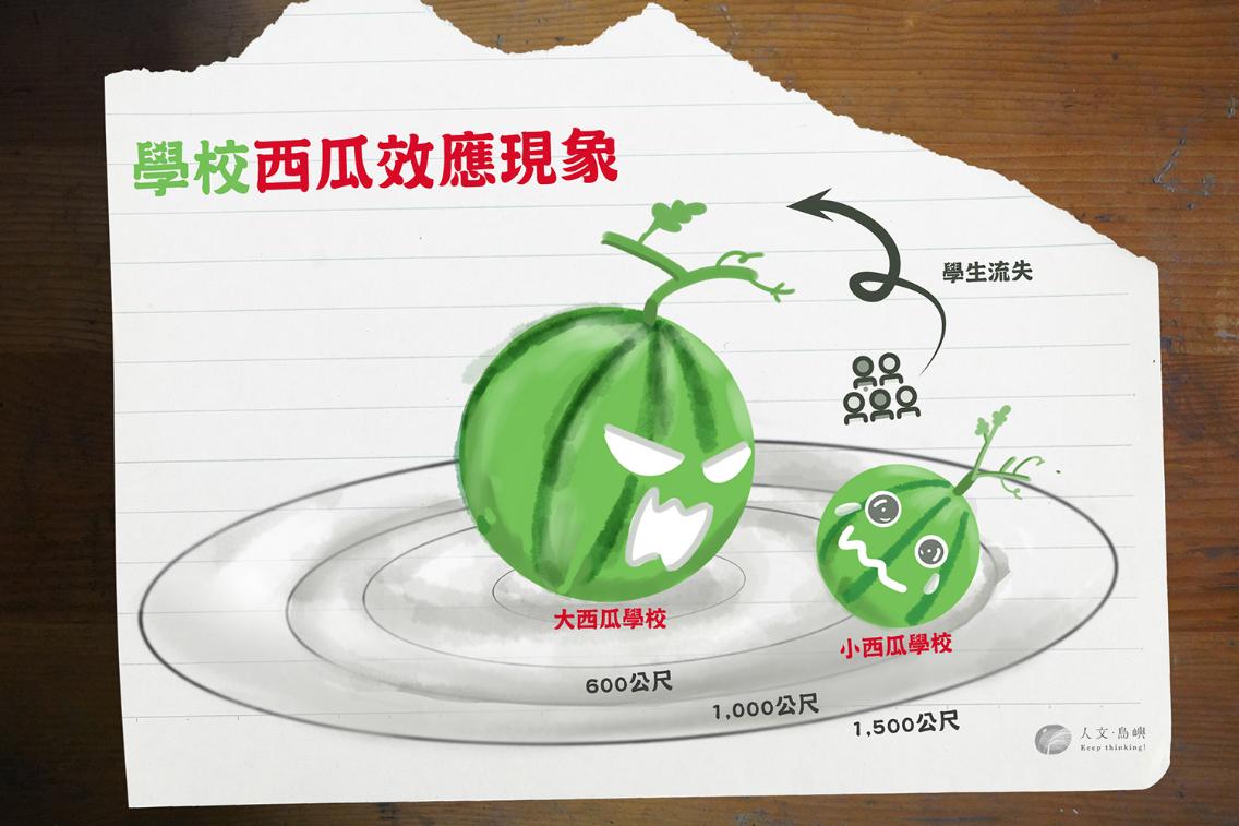 兩所學校極其鄰近(600~1500公尺內,步行不用半個小時的距離),人數規模卻差異甚大(2~2.5倍以上),便屬於「西瓜學校」。這種現象是因為家長集體「搶名校」、「擠大校」的共通心態,也就是「西瓜偎大邊」,使得「大西瓜學校」對「小西瓜學校」產生磁吸效應所致,在臺灣十分常見。 企劃腳本/林義宏 美術設計/林柏希