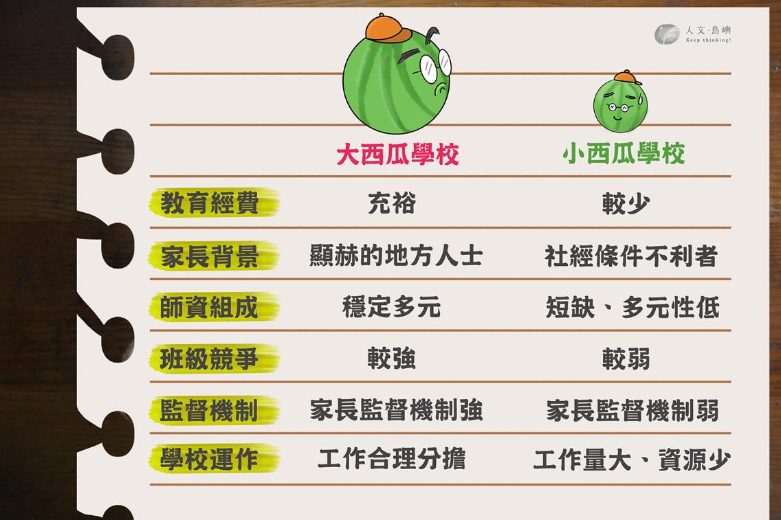 「家長選學校」看似是個人自主的選擇,然而從另一個角度看,正是這些「選擇」延續著西瓜學校的現況,不僅導致規模過小的學校陷入經營困境,亦讓教育弱勢學生反而更難取得所需的教育資源