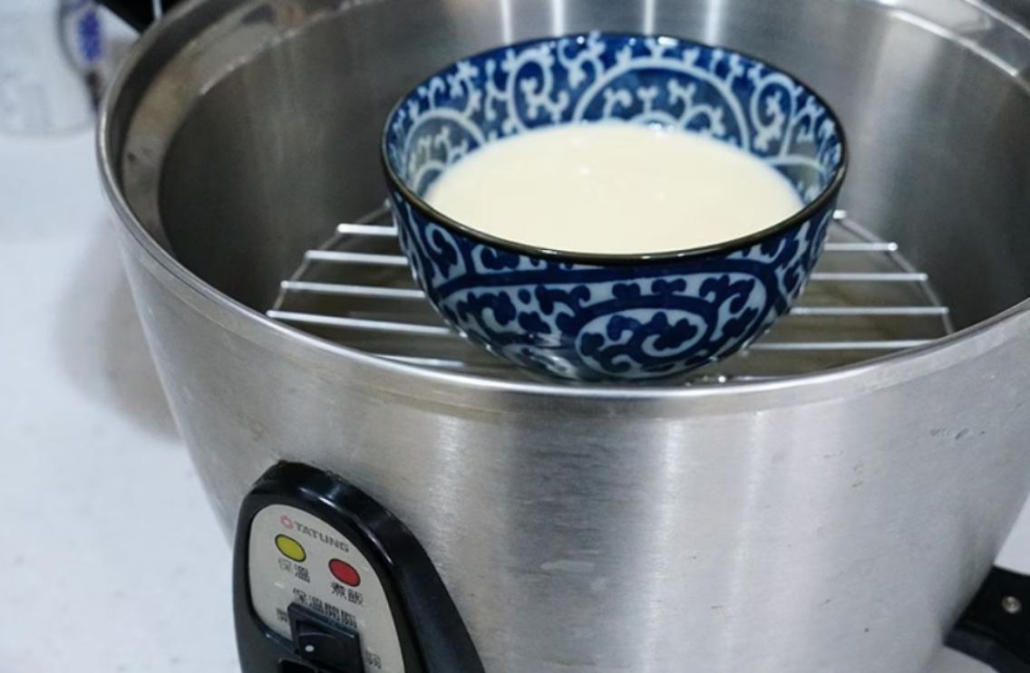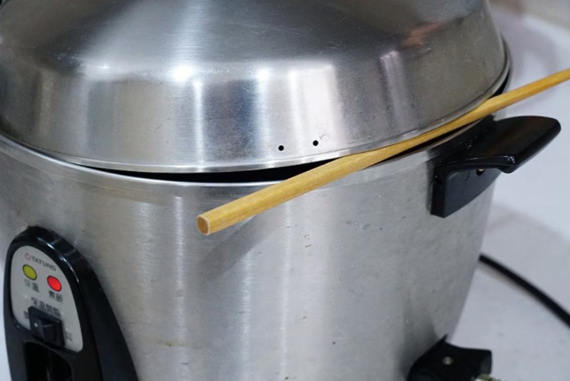蒸蛋還有一個小技巧,就是電鍋蓋不要完全閉合,可以在鍋邊夾上一隻筷子,讓鍋邊更能透氣。 這樣做的好處,可以避免鍋內的壓力過大,蒸蛋在蒸煮的過程不會一直「滾」。如果蒸蛋像水煮沸一樣滾動,蒸蛋成品就會產生很多氣泡。