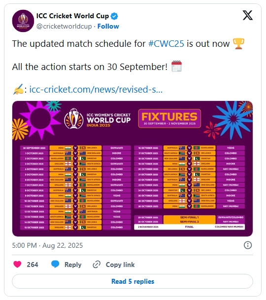 本届女子板球世界杯将于周二在瓜瓦哈蒂举行,由印度队主场迎战斯里兰卡队,决赛将则于11月2日(星期日)举行。