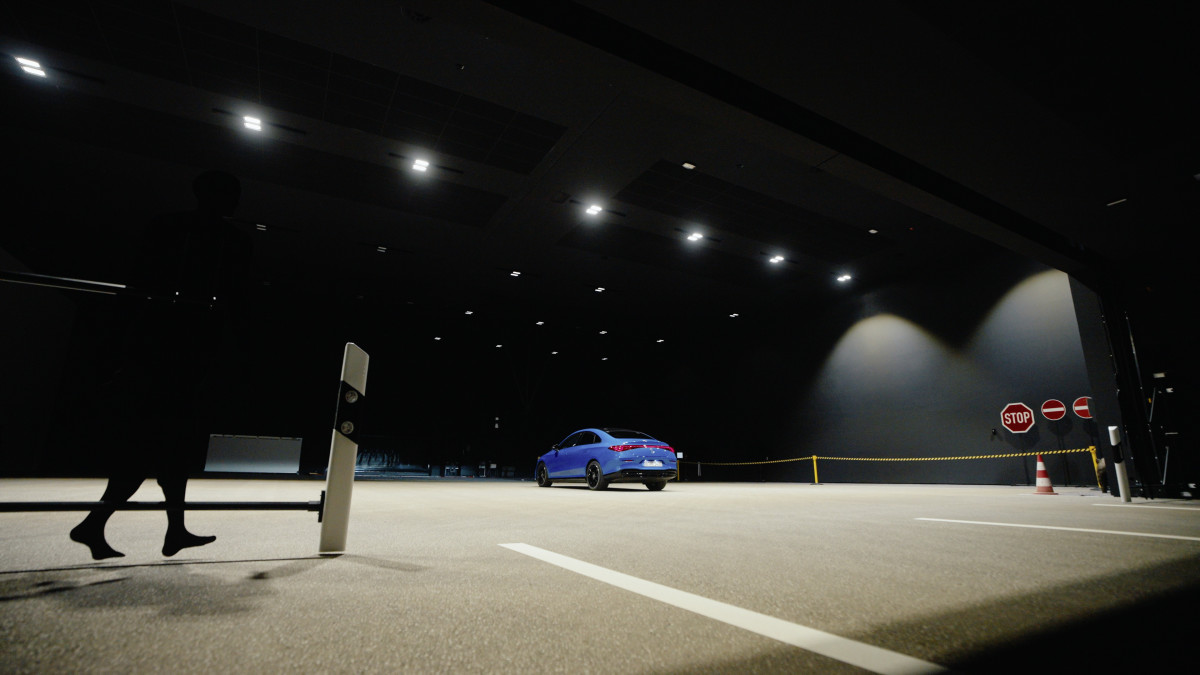 The Light Testing Center is a massive building located within the proving ground, measuring 443 feet long and 26 feet high, and designed to simulate the nighttime driving experience without Mercedes-Benz engineers having to set foot outside. Inside, Mercedes has recreated a full-scale country road, complete with custom asphalt that mimics the reflective qualities of a well-worn, heavily traveled surface. Here, engineers can test up to five cars at once, and can add testing variables that range from simulated oncoming traffic to reflective posts and pedestrian dummies stepping out into the street when you’re least expecting it.