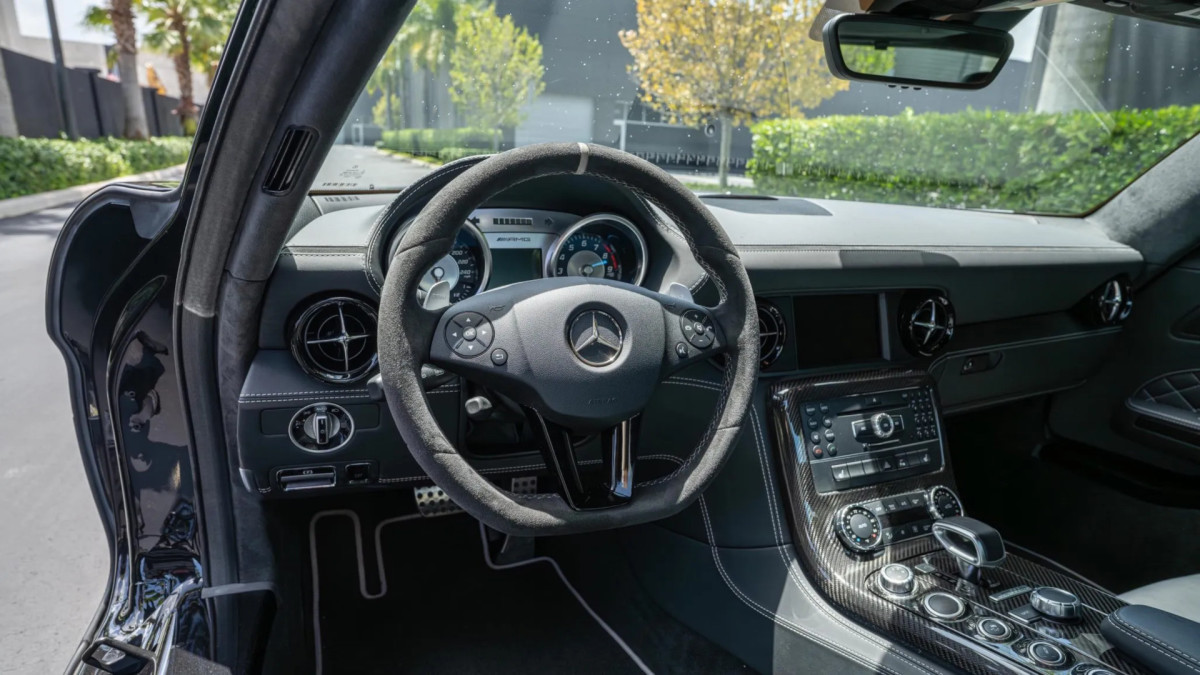 Matching the exterior details is a cabin festooned with carbon fiber and black Nappa leather, along with an Alcantara-wrapped flat-bottomed steering wheel with a grey noon marker and accent stitching. More Alcantara is found on the roof lining, and grey double-stitching gives the leather interior a bit more pizzazz, both for the dash and the quilted (and heated) seats with their grey seatbelts. Admittedly, the COMAND infotainment system was already less than stellar in its day and would be almost useless now, a decade later, but the numerous buttons and aluminum switches in this cockpit still look more special than a blank slab of screens.