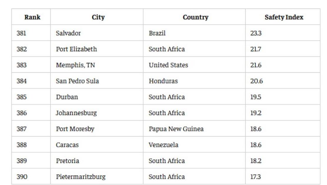 根據 Numbeo 在 2025 年中公布的犯罪指數可以發現,南非的聖彼得堡與比勒陀利亞(Petermaritzburg and Pretoria)、委內瑞拉的加拉加斯(Caracas),以及巴布亞新幾內亞的莫爾茲比港(Port Moresby),已經被視為全球最不安全的城市。而這份報告乃是依據居民對於犯罪與安全的感受與認知所作出的排名,因此更突顯了全球不同城市中心之間的鮮明對比與巨大落差。