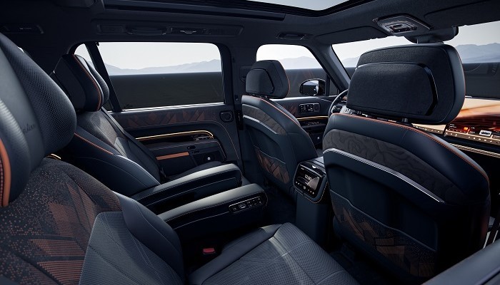 内饰延续简约风格,配备47英寸AR-HUD抬头显示、16英寸中控屏及副驾屏。其核心亮点在于2+2+2六座布局及高度灵活的座舱模式,第二排座椅可向后旋转实现与第三排对坐,并提供包括双人共憩、旅居大床在内的多种场景。全系标配双腔空气悬架、第二排零重力座椅、Soft NAPPA真皮、车载冰箱及后排隐私遮阳帘等豪华配置。
