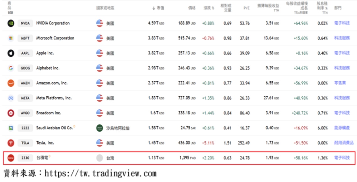 美股最近5個月走勢,對照美國總體數據,兩者似出現背道而馳現象,但在大型資訊科技與科技應用服務業股價陸續突破新高之下,企業股票總市值居前球全十名公司中,有8家是美國企業,而總市值前10名公司之中,「電子科技業」、「科技服務業」,占了其中7家,我國的台積電總市值達1.13兆美元,居全球總市值排名的第10名。顯示,總市值占全球股市約六成的美股走勢,目前完全由電子科技與科技服務業主導走勢多空。