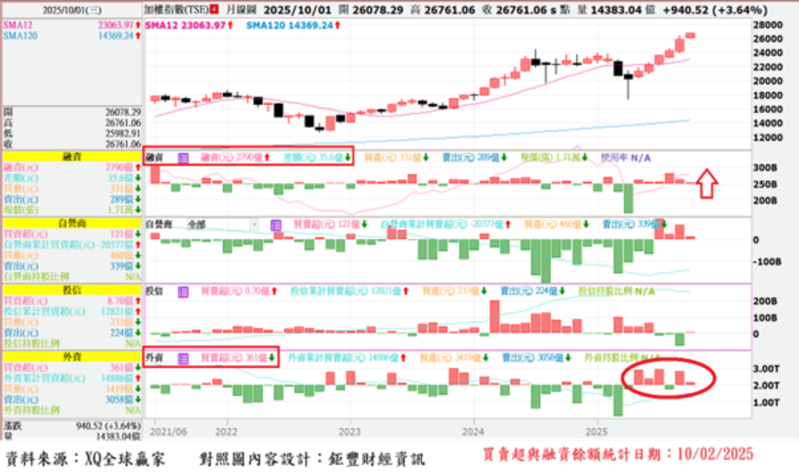 2024年7月指數前波高點24416點,融資餘額為3289億,截至2025年10月2日,台股指數續創新高,但融資餘額仍僅2790億,顯示市場氛圍仍保持戒心,隱含多頭追價力道尚未用罄,反而有利指數緩步墊高。