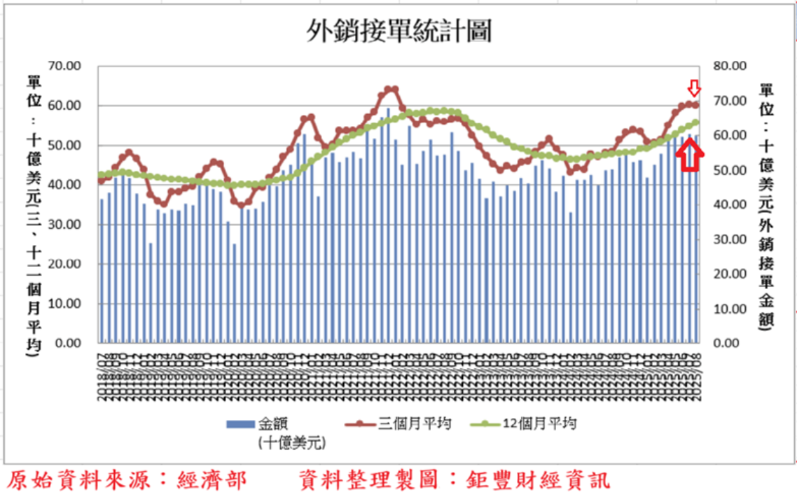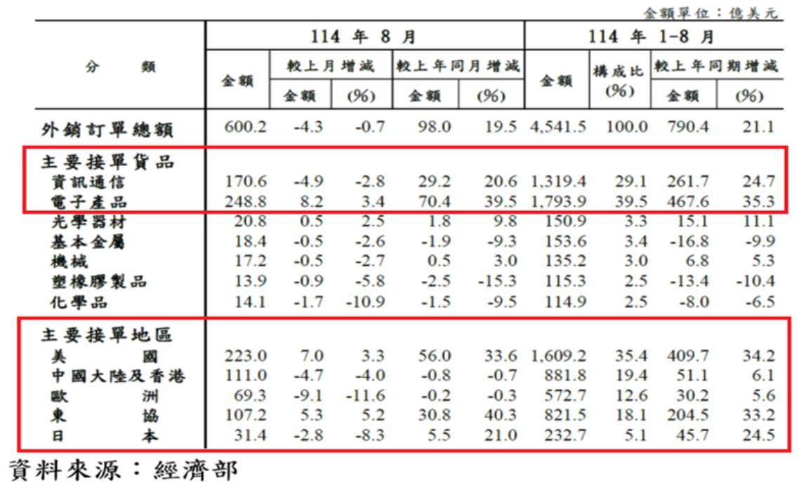 我國2025年8月外銷接單600.2億美元,月減0.71%、年增19.51%,創歷年同月新高,第二季接單金額1711億美元,則創歷年同季新高,2025年前8月外銷接單4541.5億美元,年增21.07%,明顯優於2024年外銷接單年增5.08%。
