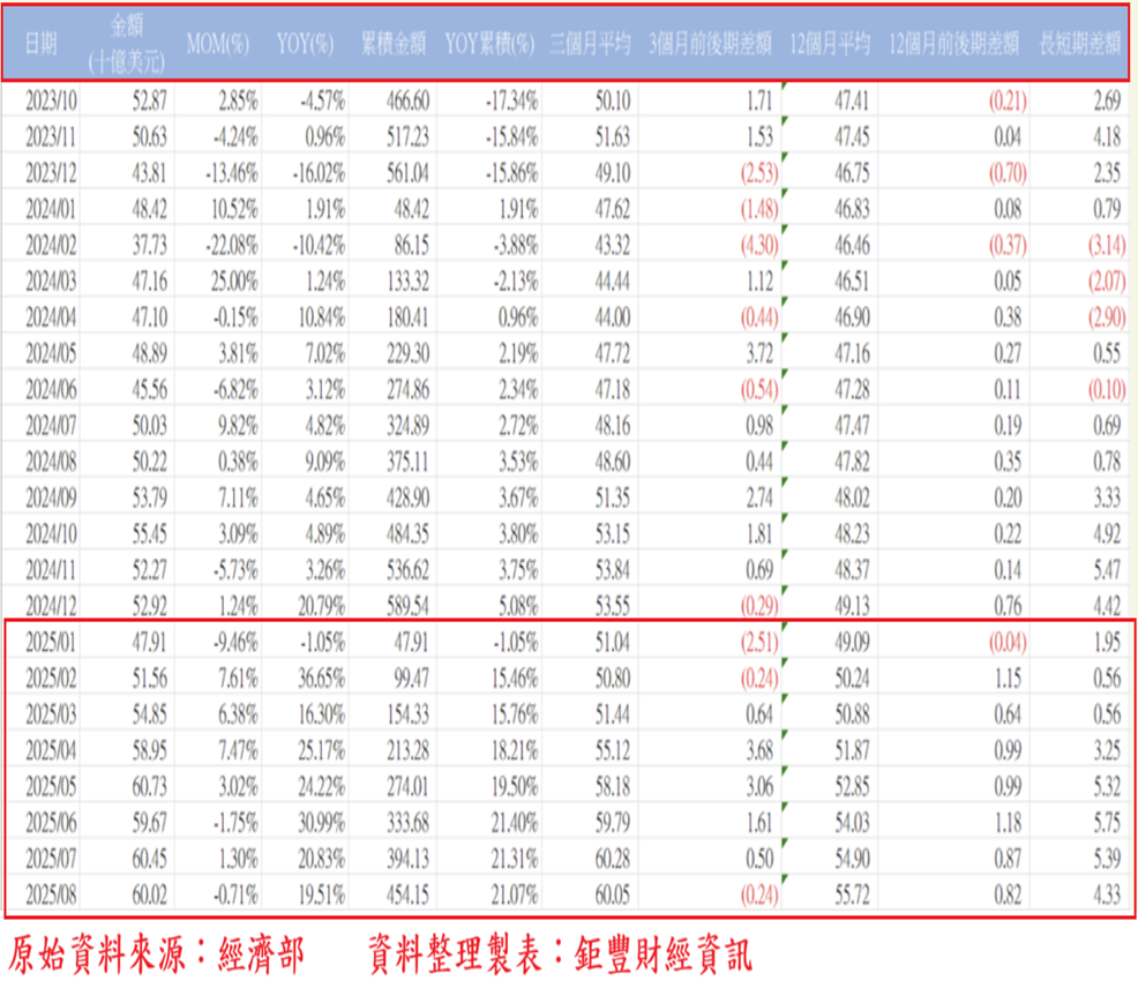 截至2025年8月,12個月平均外銷接單557.2億美元,上升8.2億美元,連續第7個月上升;3個月平均外銷接單600.5億美元,較7月下降2.4億美元,3個月平均外銷接單連續5個月回升後,出現首度小幅下降,但連續第14個月高於12個月平均外銷接單的557.2億美元,顯示長期外銷接單趨勢持續呈現成長上揚趨勢。