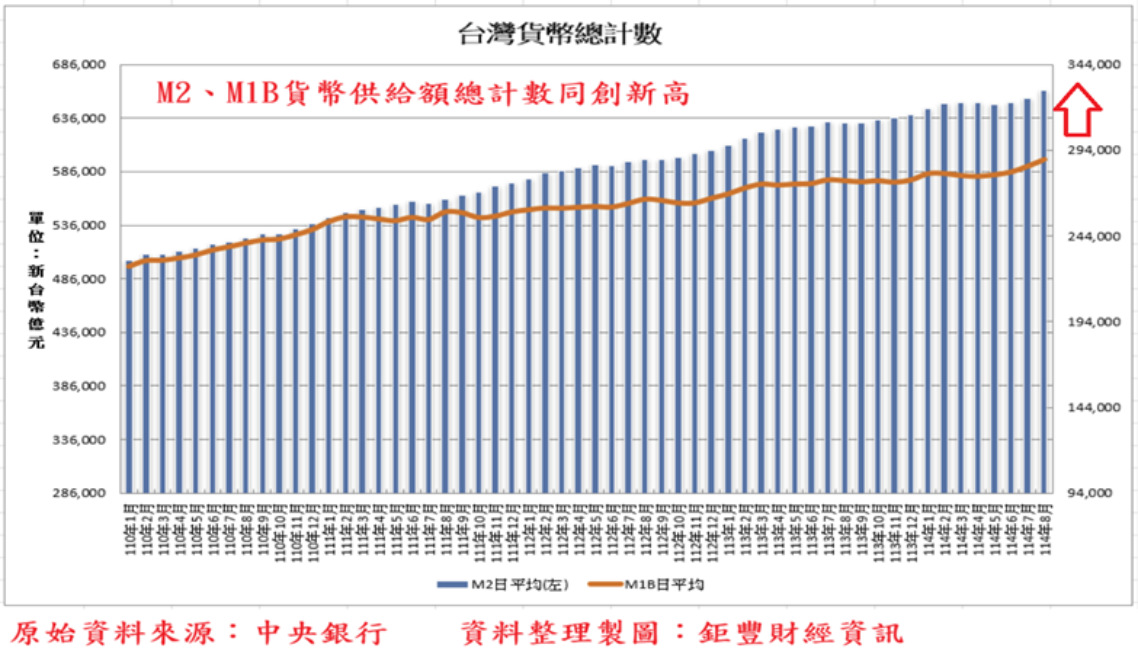 8月國內貨幣供給額M1B日平均總計數28.832兆(日平均),月增1.36%,年增4.45%,續創歷史新點,顯示國內流動性資金處於歷史最高水位,8月M2總計數66.1848兆,月增1.24%、年增4.75%,再創歷史新高。廣義貨幣供給額的M2總計數與狹義的貨幣供給額總計數同步在歷史最高點,顯示國內整體資金水位仍在歷史最高水位,整體潛在資金仍相當充沛。