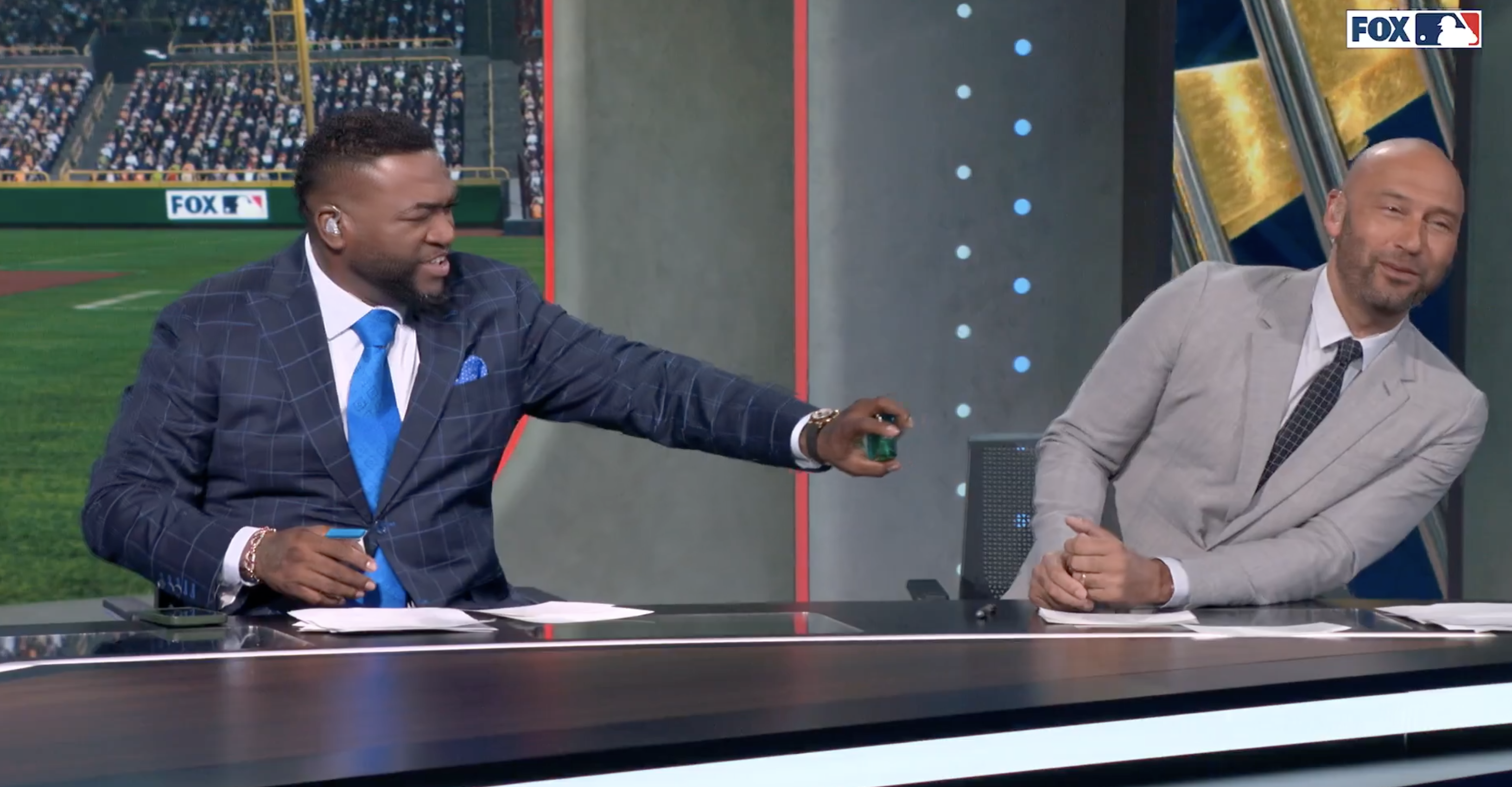 The Boston Red Sox legend grabbed the cologne bottle and sprayed it onto his former New York Yankees rival.