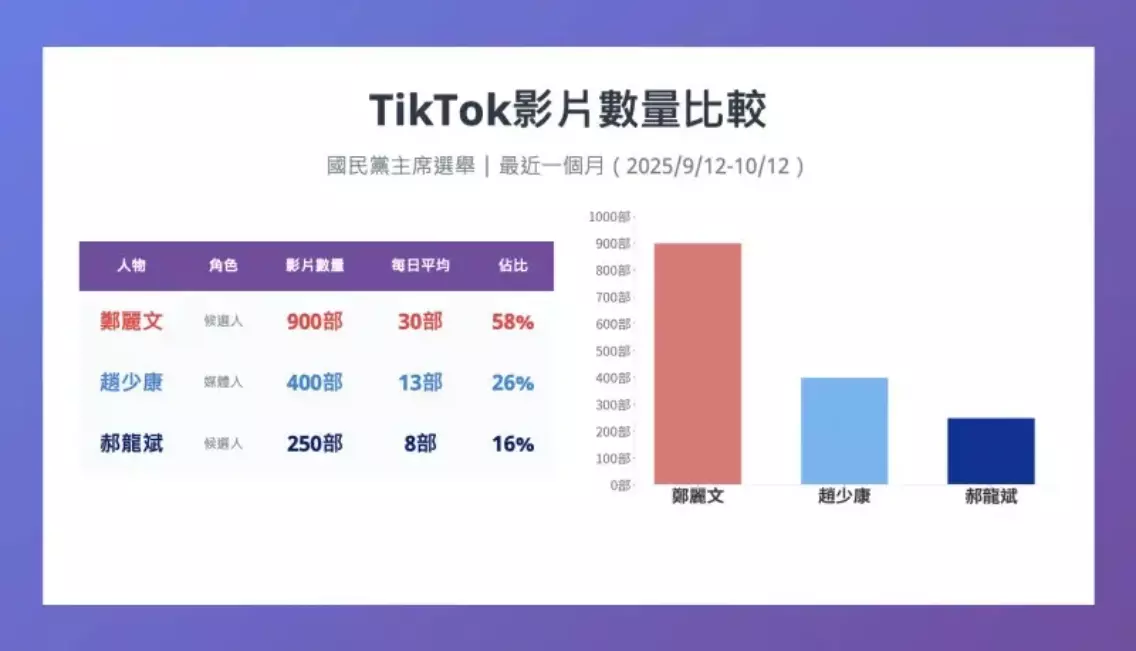 前中廣董事長趙少康也舉行記者會稱,TikTok最近一個月,與國民黨主席選舉相關共1790部,與鄭麗文有關的影片高達900部,占58%,同時影片出來後,接著就有轉發、二製、三製,殺傷力很強。