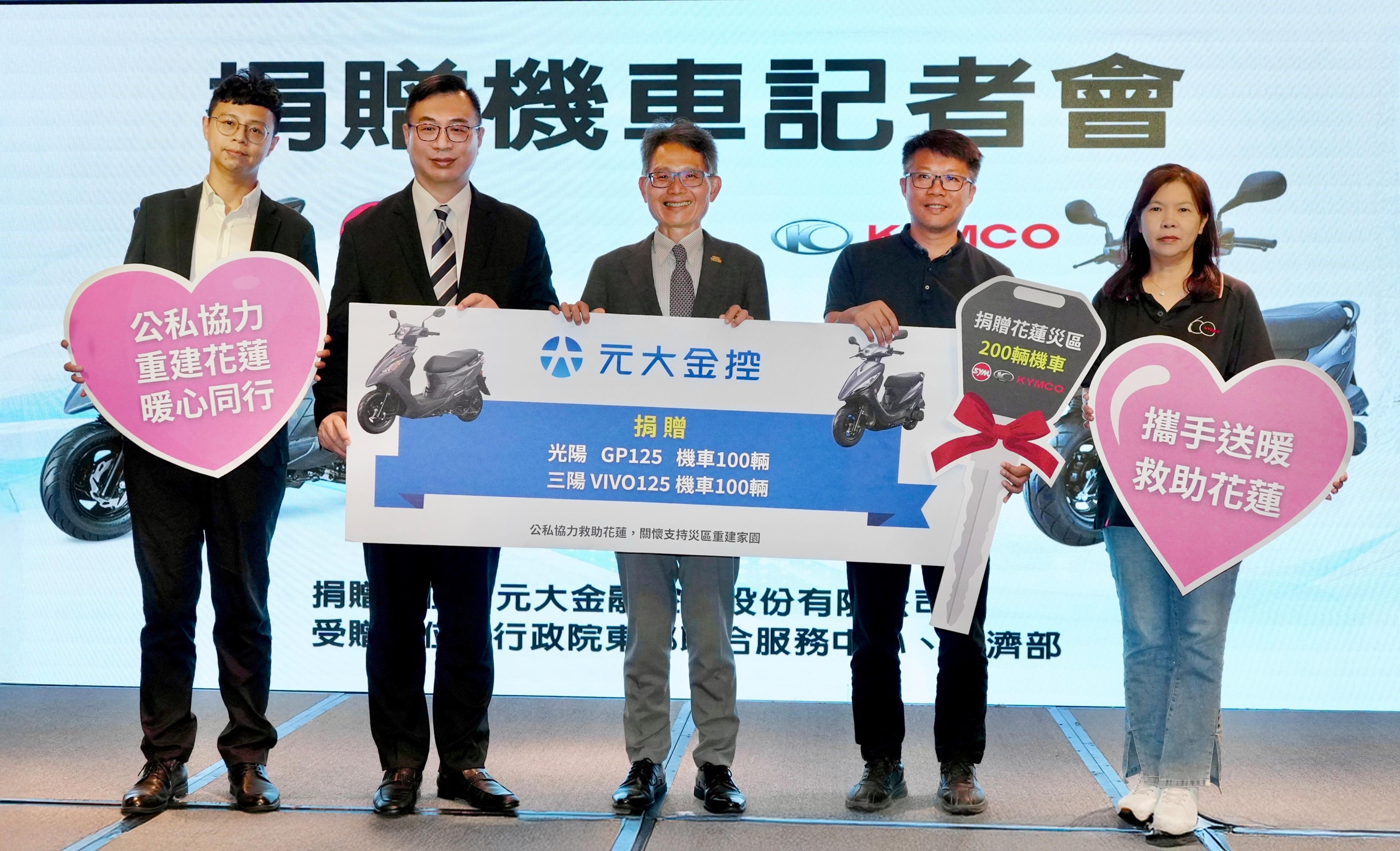 為協助花蓮馬太鞍溪堰塞湖溢流受災戶早日回歸正常生活,元大金控旗下子公司元大證券、元大銀行、元大人壽、元大投信及元大期貨,共同捐贈機車200台予災區。