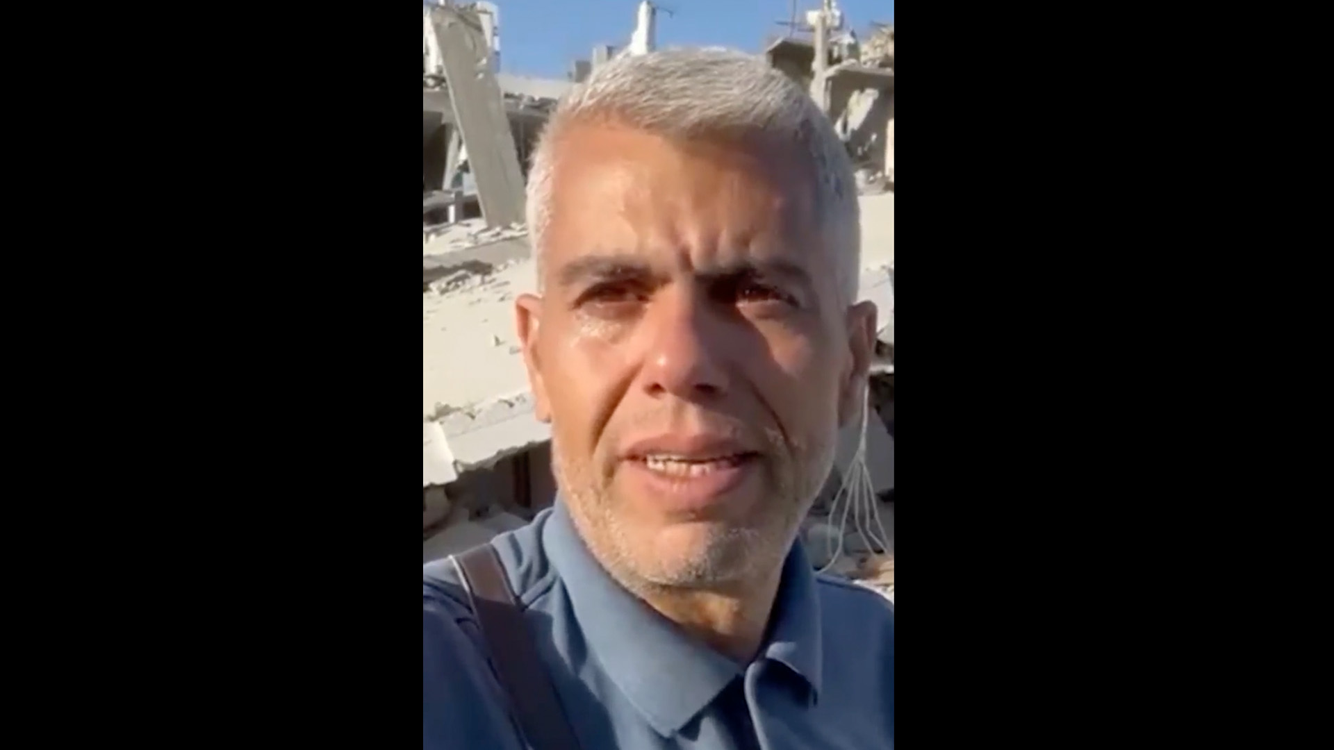 巴勒斯坦记者在被毁房屋废墟前哭泣