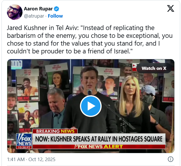 贾里德·库什纳在特拉维夫表示:“你们没有复制敌人的野蛮行径,而是选择与众不同,选择捍卫自己所代表的价值观,我为成为以色列的朋友而感到无比自豪。”
