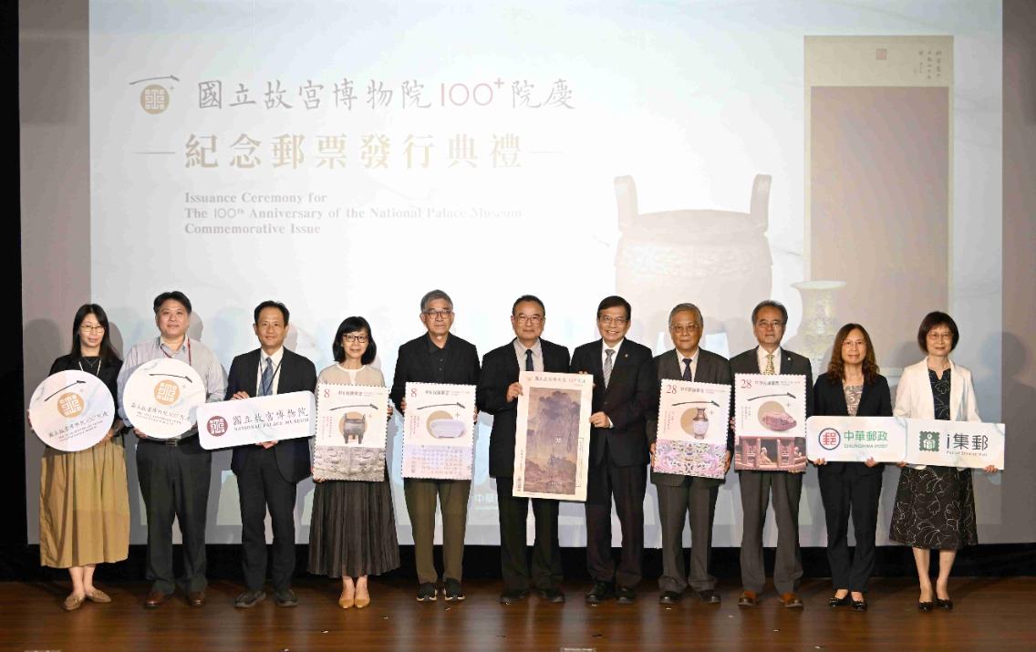 為慶祝國立故宮博物院一百週年,中華郵政公司與故宮攜手合作,於今(17)日發行「國立故宮博物院100﹢院慶紀念郵票」,並於下午辦理發行典禮,此次共發行1套4枚及小全張1張,將商周時期的〈嬰祖丁鼎〉、北宋時期的〈汝窯 青瓷無紋水仙盆〉及〈宋 范寬谿山行旅圖 軸〉、清乾隆年間的〈洋彩玲瓏轉旋瓶〉與〈雕橄欖核舟〉等5件館藏文物收於方寸之間,集郵迷收藏郵票就等於就是典藏國寶。