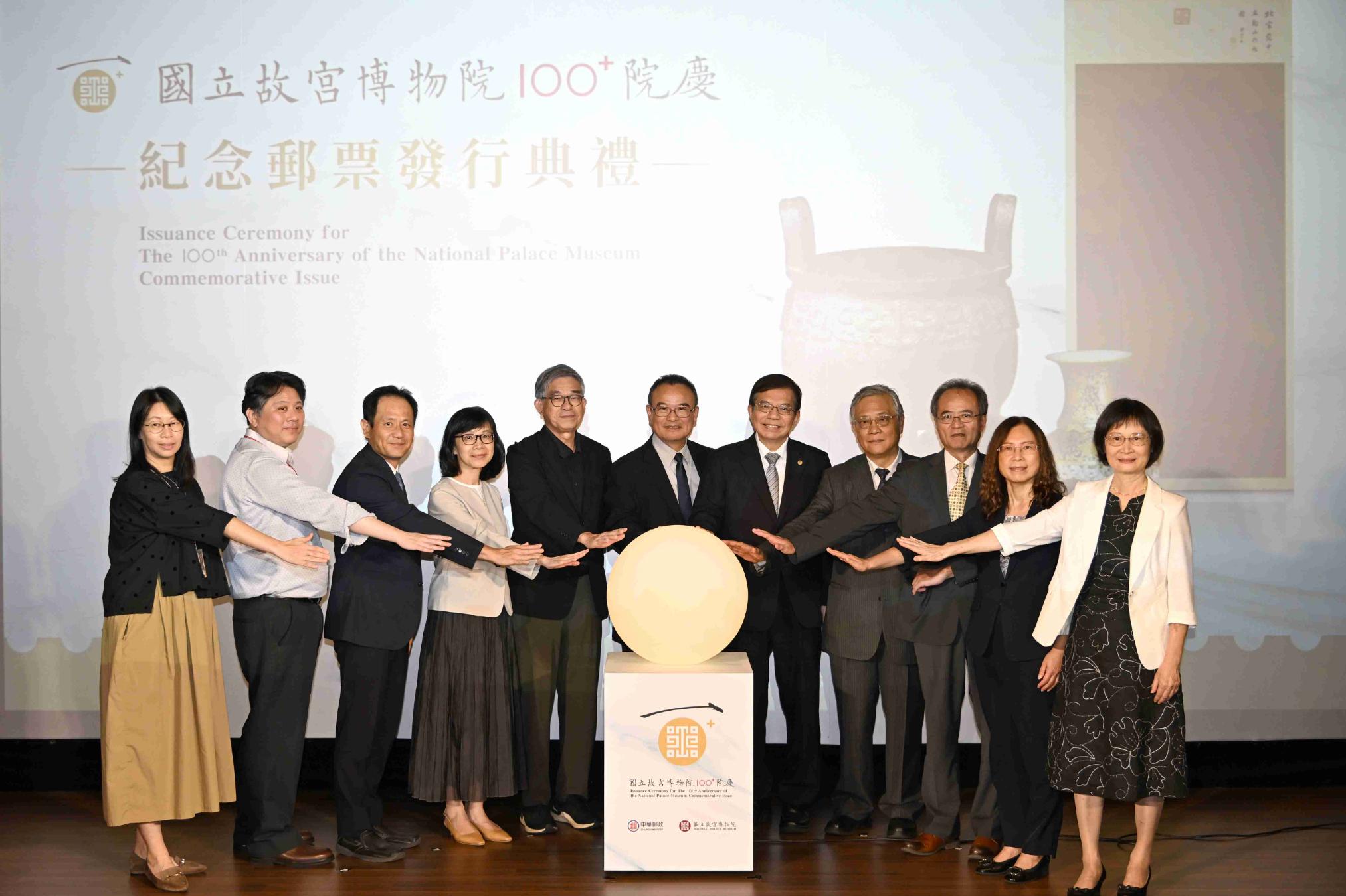國立故宮博物院100﹢院慶紀念郵票揭幕儀式(左起:國立故宮博物院 器物處處長吳曉筠、書畫文獻處處長何炎泉、主任秘書王耀鋒、副院長余佩瑾、副院長黃永泰、院長蕭宗煌、中華郵政公司董事長王國材、中華集郵團體聯合會榮譽理事長陳友安、中華郵政公司總經理江瑞堂、副主任委員王婉如及處長鄭麗華)。(圖片來源/中華郵政)