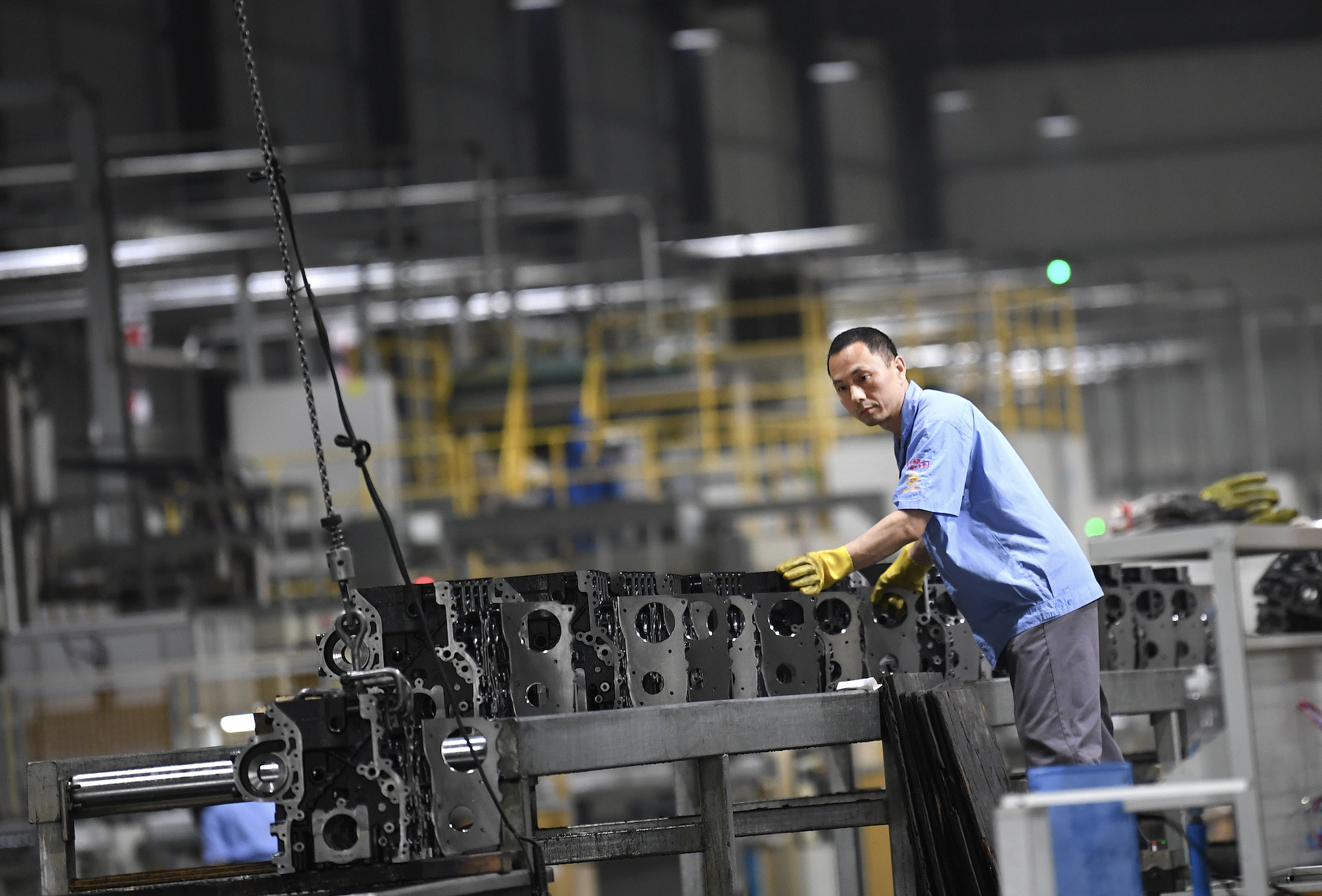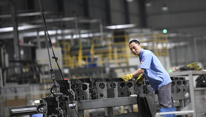2021年5月7日,长源朗弘科技有限公司员工在抓紧生产发动机缸体。图片来源:CFP