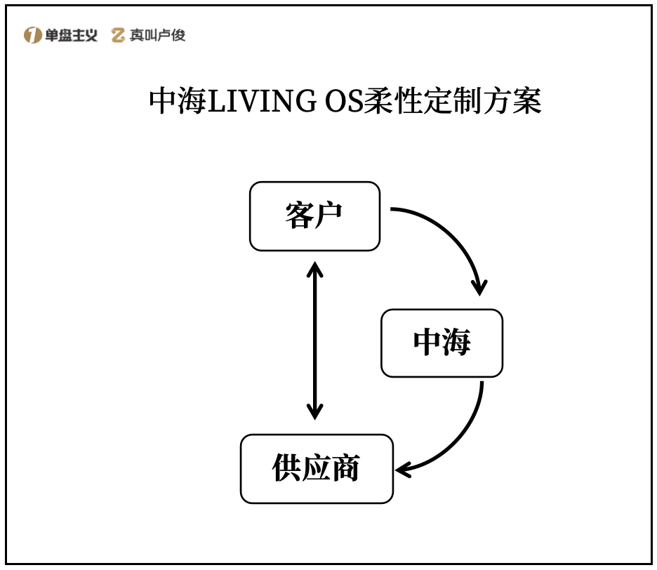 但这也还不是最精妙的地方。区别于传统供应商向甲方提供服务的单箭头模式,在中海针对年轻客户提出的柔性定制方案里,我又看见了一个新模式:智选体系。