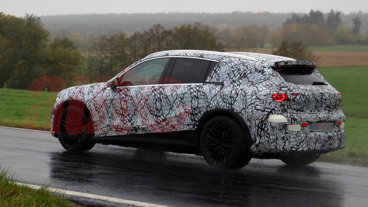 It's been nearly two months since Mercedes launched the all-new GLC EQ electric crossover, and now Affalterbach's attention has turned to the AMG variant. Testing is now underway on and around the Nürburgring, where our spies have caught this nearly production-ready prototype, and although a reveal is still some way off, this test mule has revealed plenty to the camera, including its interior. But first, let's take a closer look at the exterior, which, like the AMG-enhanced CLA we spotted in June, will have active aerodynamic aids. It's a little unusual seeing a crossover with such a pronounced spoiler, but AMG's brainiacs must see a benefit to the device if it's here.