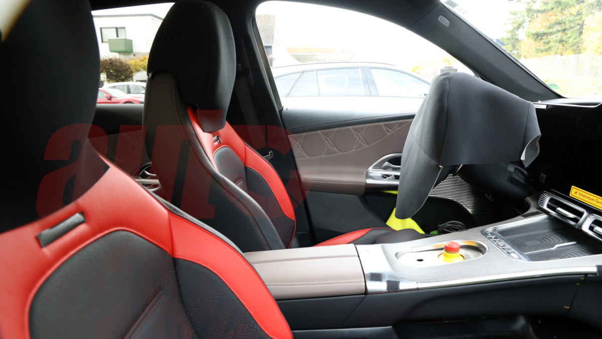 Moving on, and the engineers have elected to apply some black vinyl to the rocker panels and doors at an angle, which suggests they're trying to hide something special. Perhaps more active aero will find its way to the side skirts. False cladding under the vinyl camouflage, as well as a concealed C-pillar, are further attempts at obscuring the true design, and we see more of the same on the hood. Up front, a flat face will house a large Three-pointed Star, and we can expect AMG-specific styling for the front and rear fascias.