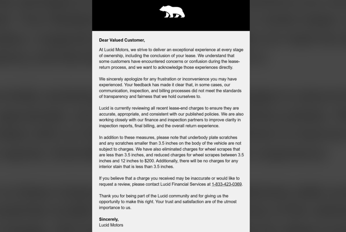 “We sincerely apologize for any frustration or inconvenience you may have experienced,” said the letter from Lucid. “Your feedback has made it clear that, in some cases, our communication, inspection, and billing processes did not meet the standards of transparency and fairness that we hold ourselves to.”
