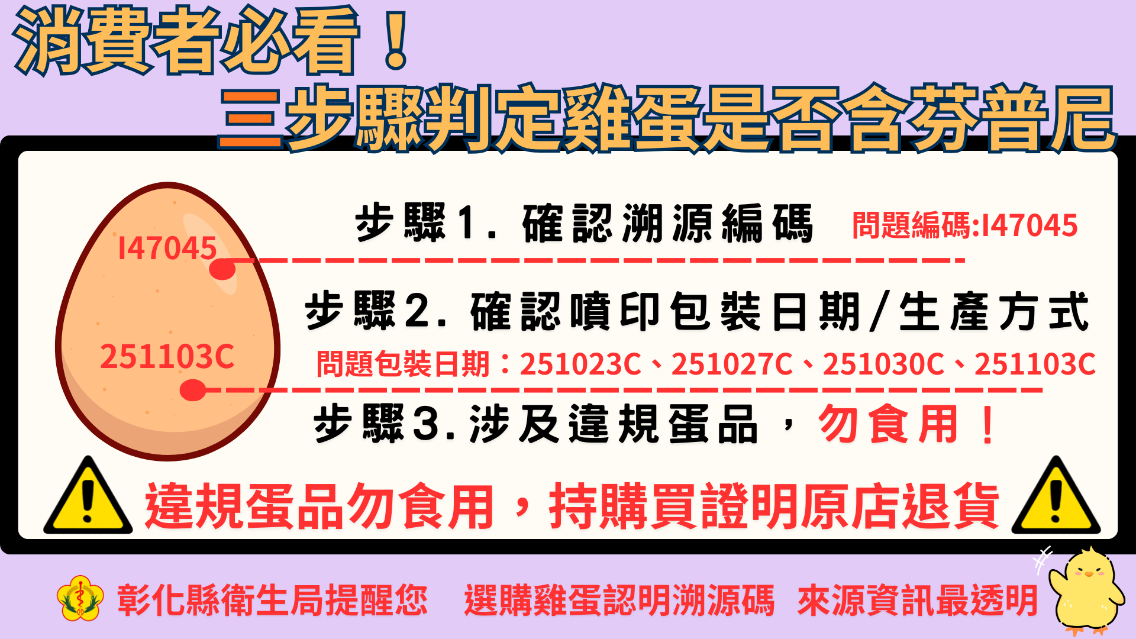 本次檢出農藥芬普尼具噴印溯源編號包括「I47045-251023C」、「I47045-251027C」、「I47045-251030C」及「I47045-251103C」,總計15萬顆,食藥署表示,如果民眾有疑慮,「I47」溯源編號的雞蛋先就不要吃,立即停止食用並退貨。