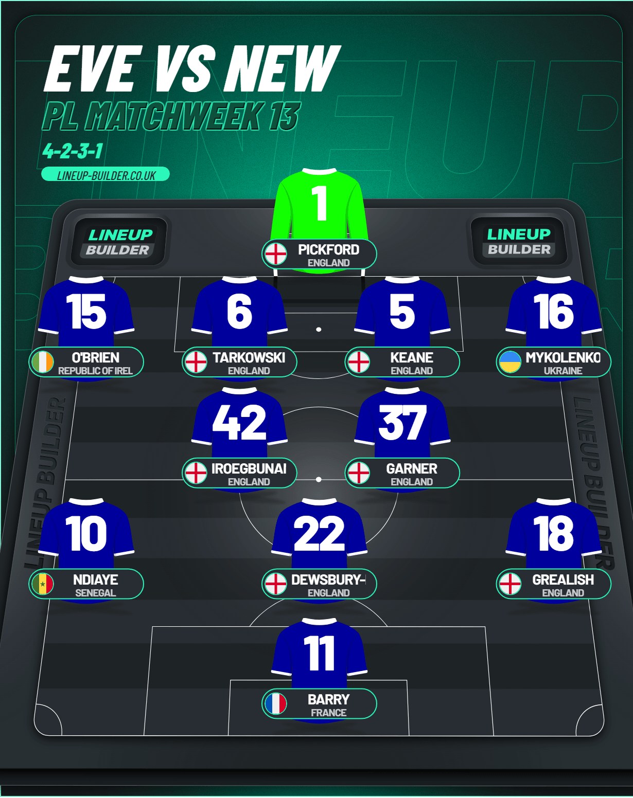 Midfielders: Gueye (SUSPENDED), Garner, Iroegbunam, Dewsbury-Hall, Röhl (INJURED)