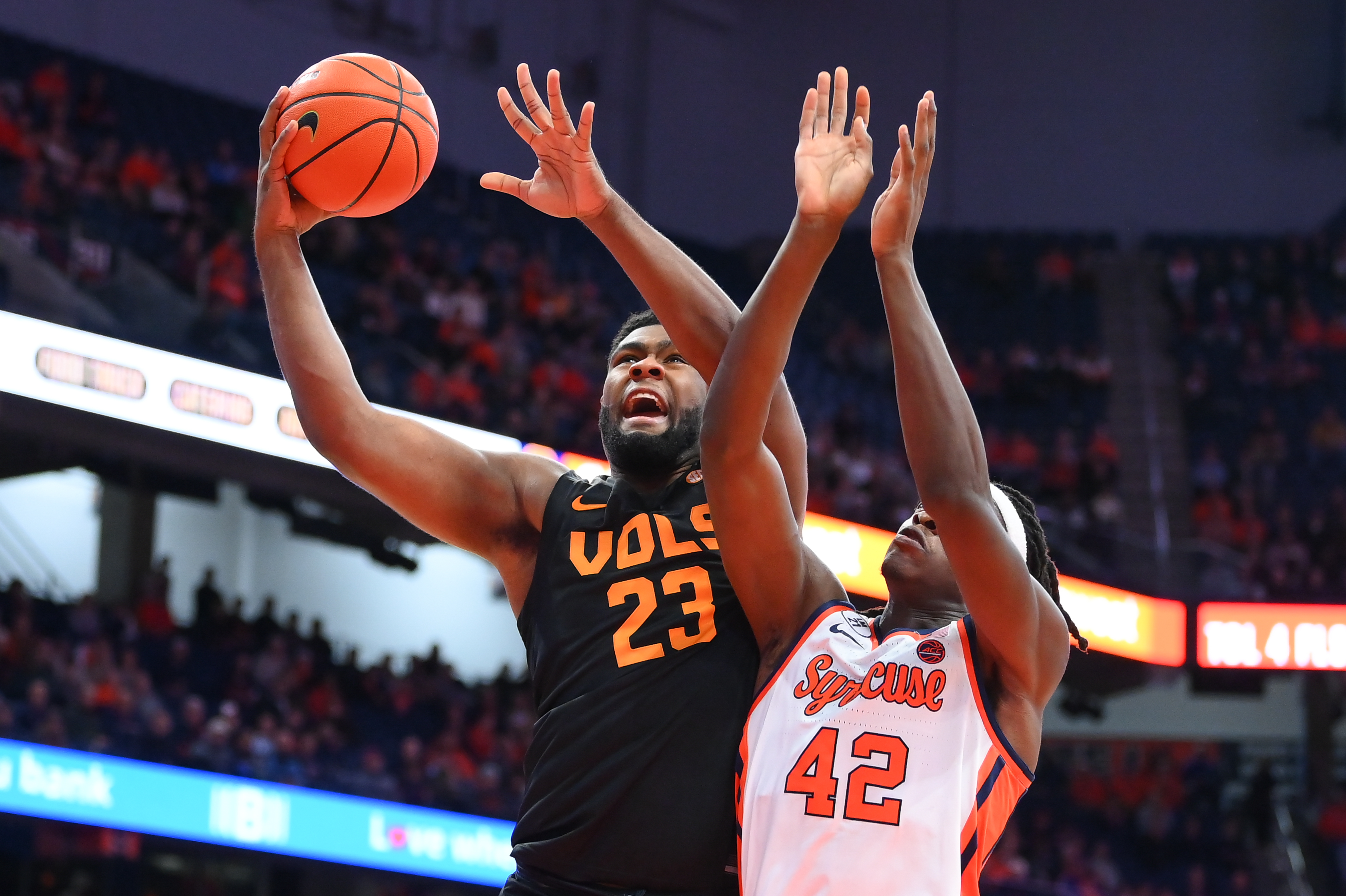 A couple of turnovers would turn into a couple of dunks for Syracuse to open the second half. Sloppy, chaotic play from the Volunteers wasn’t cutting it, and the Orange grew their lead out to 40-36 in the opening four minutes. Syracuse’s William Kyle was suddenly dominating the paint on both ends of the floor, coming away with block after block as Tennessee tried to force the ball to the rim.