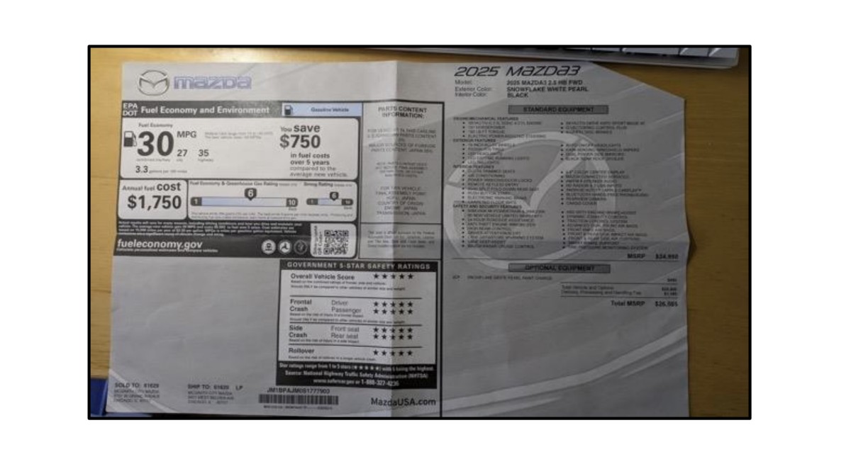 “[l am] looking into the issues . . . it appears that there are typos on the Window Label / Monroney Label for the 2025 Model Year Mazda3 Hatch 2.5 S Base Trim.”