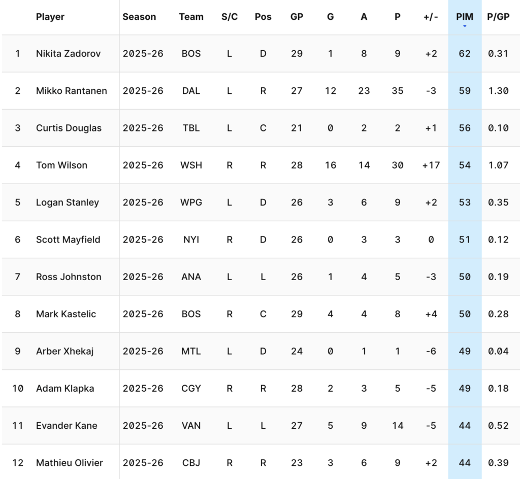 But unlike most of his company on this list, he is still racking up the points all at the same time. That’s quite impressive, especially considering he has been on the ice a heck of a lot more than normal with all of the penalties and game misconducts.