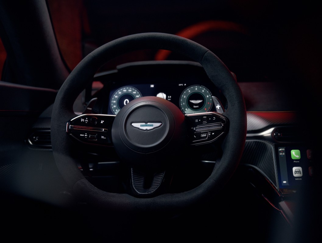 Embroidered 'S' logos are found on the sporty seats, while the legendary Aston Martin wings are stitched into the headrests. The infotainment suite should include Apple's new CarPlay Ultra - the new software has been rejected by many automakers, but Aston Martin became one of the first automakers to adopt it.