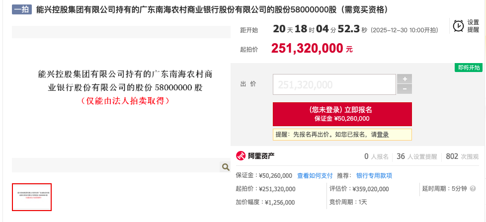 阿里资产司法拍卖平台,12月30日,能兴集团持有的广东南海商业银行5800万股、700万股股份将进行公开拍卖,起拍价合计2.82亿元,较估值折价30%。