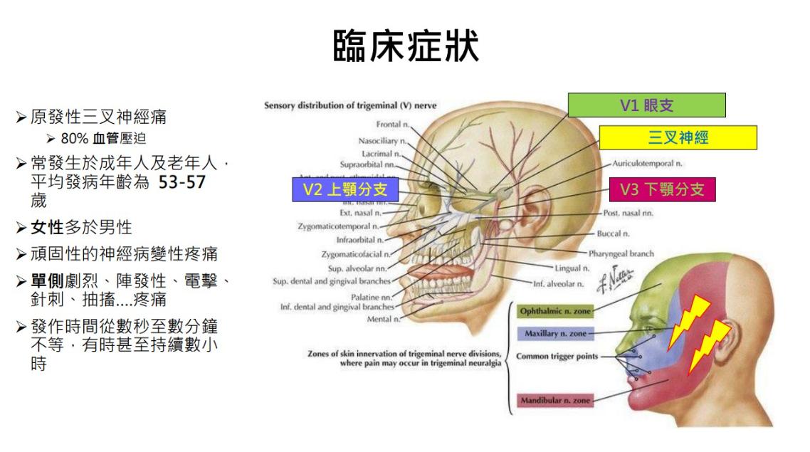 徐永吉先指出,三叉神經痛多發生於中老年族群,平均發病年齡約53至57歲,女性多於男性。三叉神經分為三支眼支(V1)、上顎支(V2)與下顎支(V3),疼痛通常為單側,病患常形容為「電擊」、「針刺」、「抽痛」感,發作時間從數秒到數分鐘不等,有時可持續數小時。