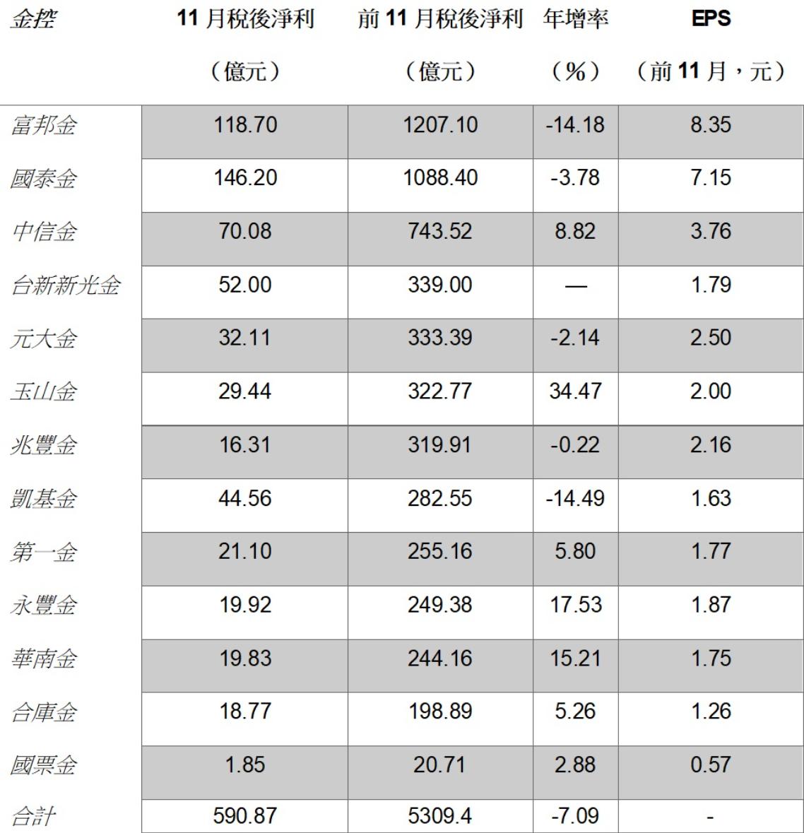 若以「前11月年增率」觀察,共有7家金控維持正成長,包含玉山金、永豐金、華南金、第一金、合庫金、國票金與中信金,其中玉山金年增34.47%居「成長王」,永豐金年增17.53%、華南金年增15.21%表現同樣突出。