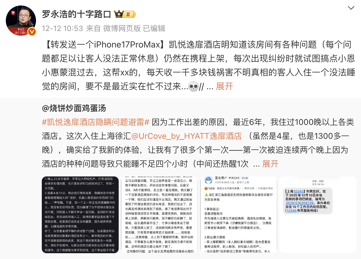 随后,罗永浩转发了该博文,并评论称“凯悦逸扉酒店明知道房间有各种问题(每个问题都足以让客人没法正常休息),却仍然在携程上架,每次出现纠纷时就试图搞点小恩小惠蒙混过去。每天收一千多块钱祸害不明真相的客人,入住一个没法睡觉的房间,要不是最近实在忙不过来……”