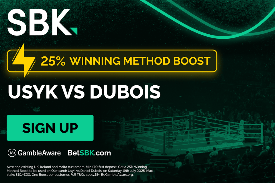 SBK are offering new and existing customers a 25% winning methord boost for Saturday night’s fight, which can be claimed by following this link*.