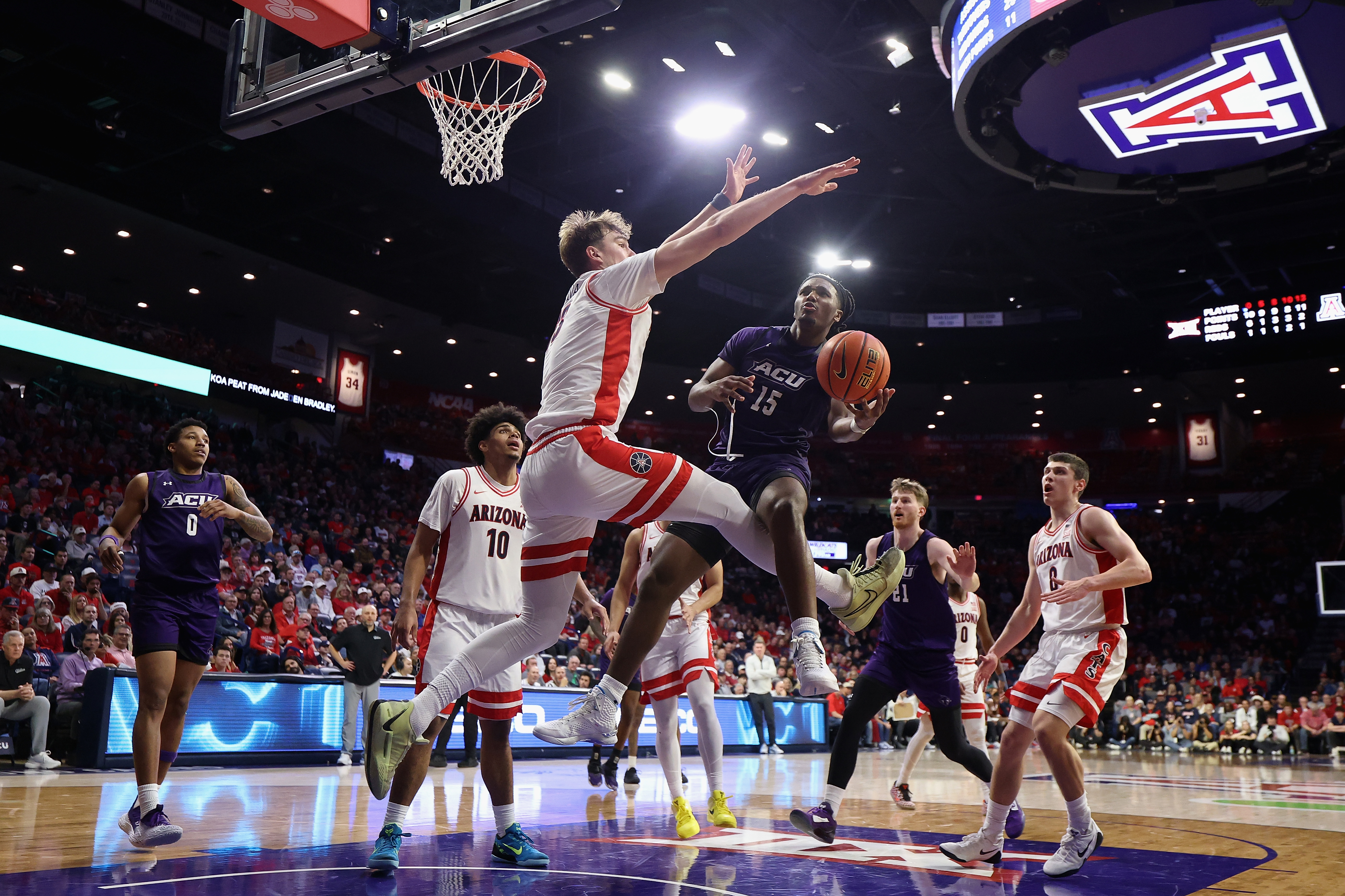 Motiejus Krivas had 15 points (making all four of his shots), Ivan Kharchenkov had 11 and the trio of Tobe Awaka, Jaden Bradley and Koa Peat each had 10 with Bradley getting all his points at the line. Bradley is the first UA player in at least 30 years to score in double figures without making a field goal.