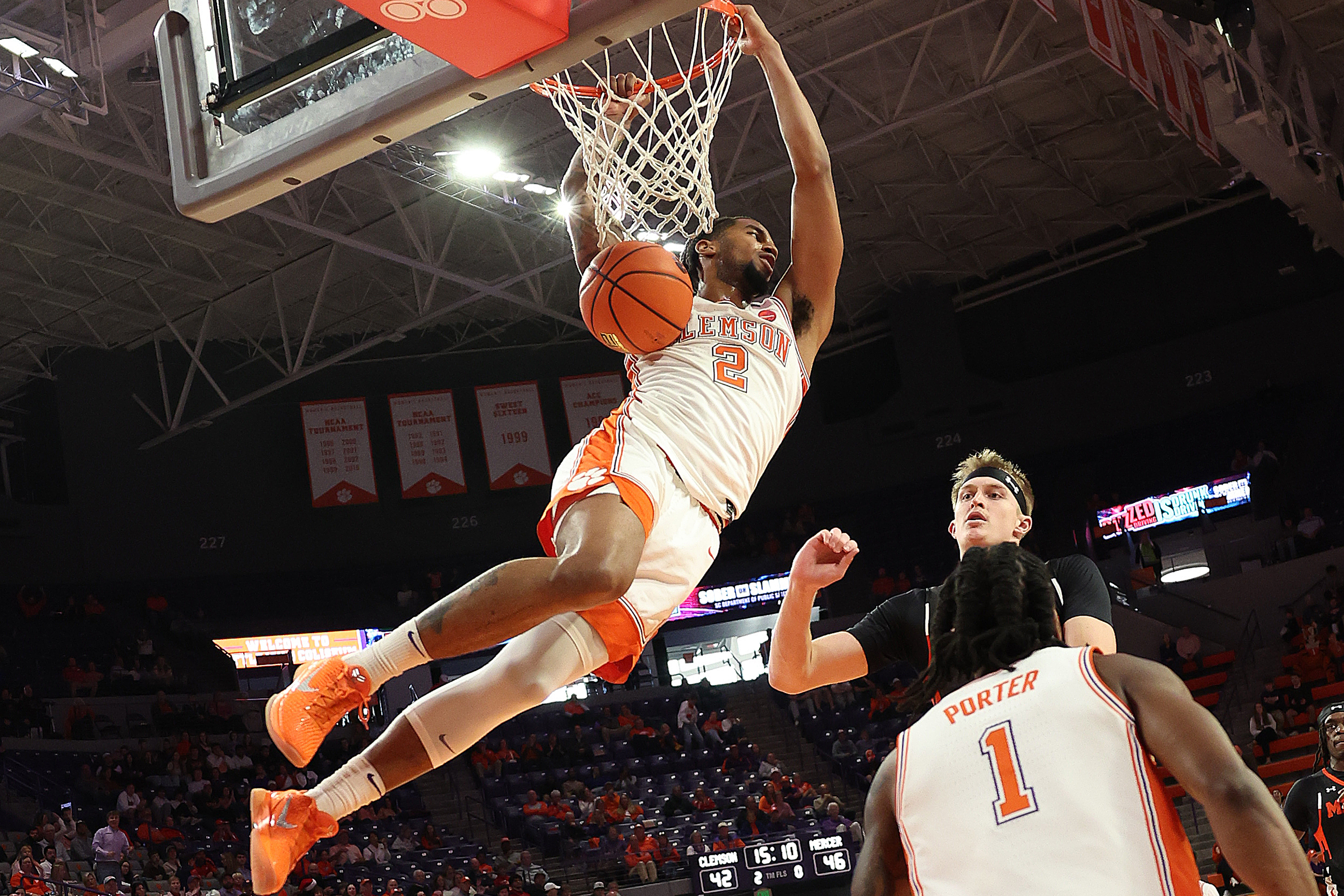 With a sellout crowd of 9,000 filling Littlejohn Coliseum with energy, Clemson somehow managed to come out with a dull thud. The Tigers tried to force the ball inside to RJ Godfrey early and after several missed layups and over 3 minutes of game time before the first Tiger basket, South Carolina had managed to jump out to a 12–5 lead behind Mike Sharavjamts’ 6 early points. Clemson responded with a decisive 17–3 run midway through the half, fueled by balanced scoring led by RJ Godfrey and Dillon Hunter to propel Clemson into a double digit lead and put the Gamecocks into danger of getting run out of the building early.